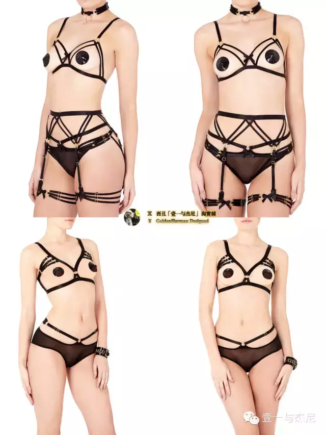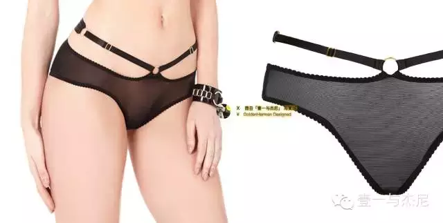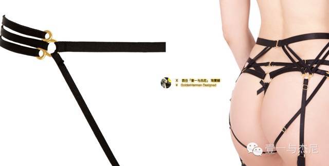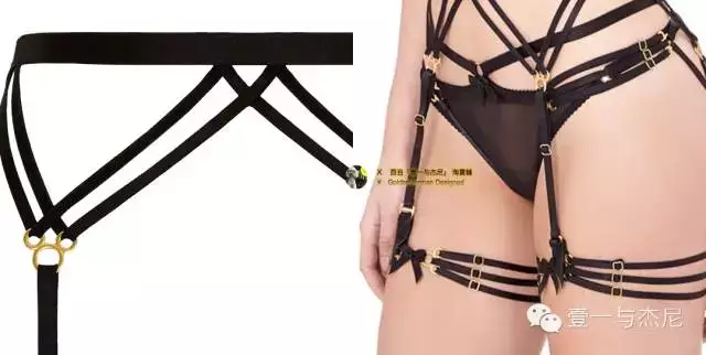 这件四爪吊袜带用简洁的线条捆绑出性感腰身,三环相扣的18K镀金圆环连接着吊袜夹与腰间绑带,搭配同系列裸臀底裤,性感核弹头……