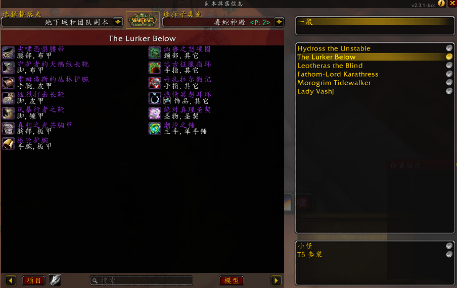 第二阶段:这时boss会下潜,然后召唤出9只娜迦鱼人,6只弓箭手,3只战士。娜迦弓箭手:2万血左右,远程攻击,娜迦战士:4万血左右,伤害挺高,基本布甲皮甲等护甲低的职业一刀一个是没有问题的。这时安排坦克优先接住战士再去拉远程,远程虽然也有伤害,但是伤害达不到秒人,战士怪打人就很可能导致减员。而且战士怪还会闪现,无论是近战还是远程,都最好看着仇恨列表打,千万别OT。别突然闪现到你面前,死得不明不白的。