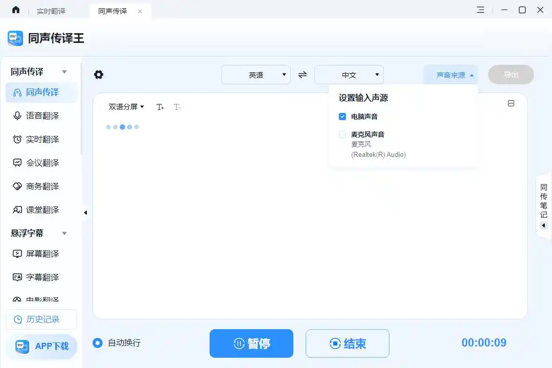 语音翻译:点击麦克风图标开始说话,系统自动识别并输出翻译结果,支持外录(环境音)与内录(设备内音频)切换。