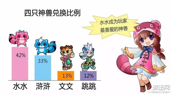 水水凭借颜值和实力成为玩家最喜爱的神兽,四只神兽兑换比例分别为水水42%、浒浒33%、文文13%、跳跳12%。