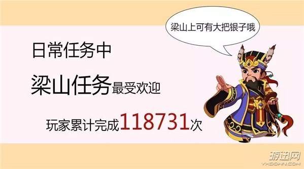 在水Q的一系列游戏活动中,梁山任务最受欢迎,玩家累计完成118731轮(每轮20次任务),从公明哥哥手上获得大量银两和经验。