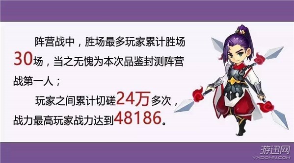 阵营战中,胜场最多玩家累计胜场达到30场,当之无愧为本次品鉴封测阵营战第一人;玩家之间累计切磋24万多次,战力最高玩家战力达到48186。